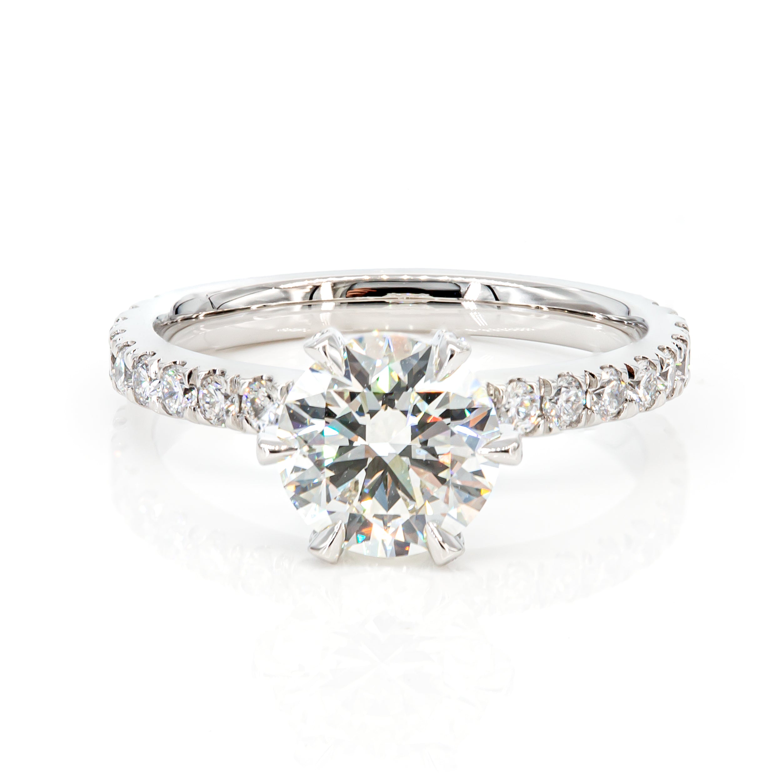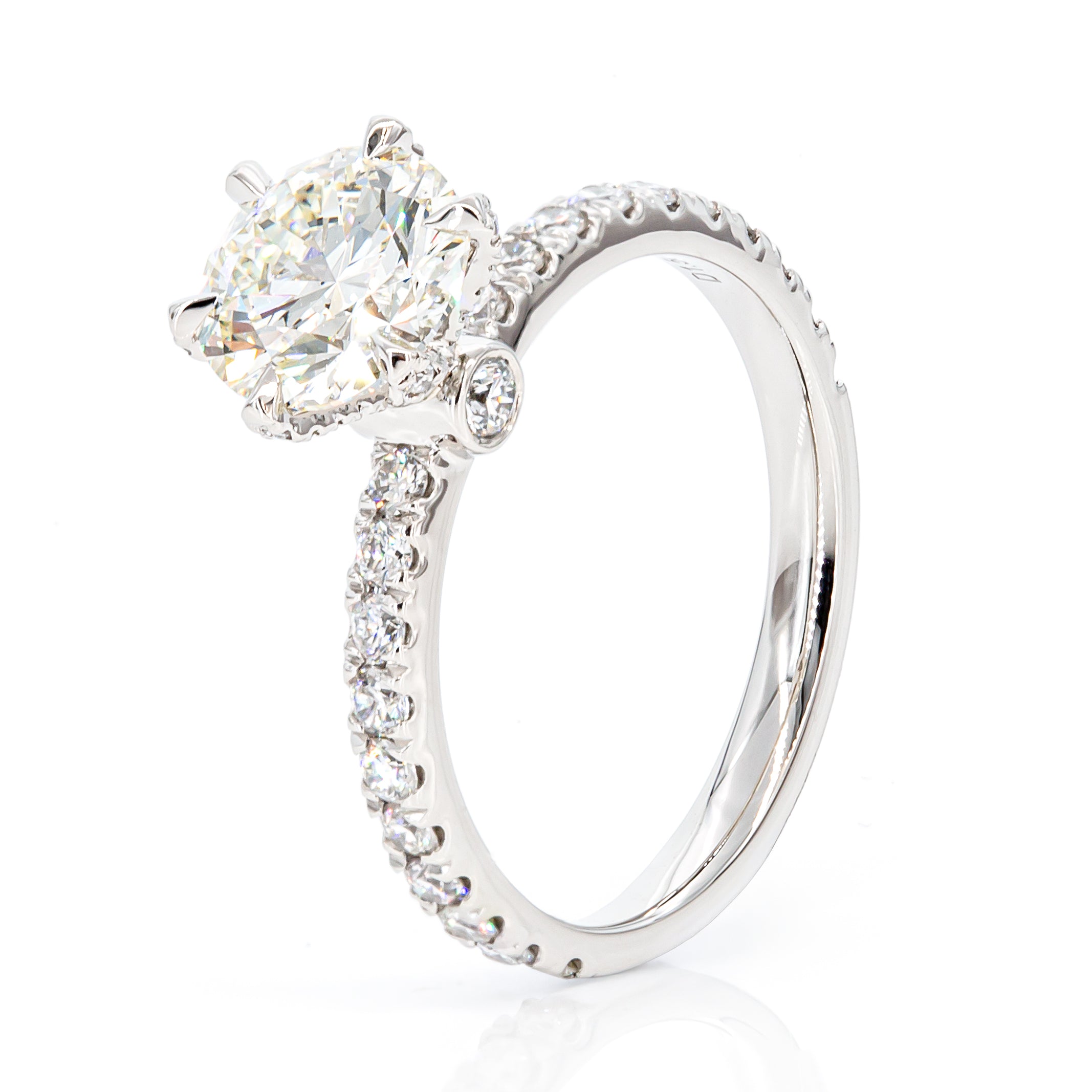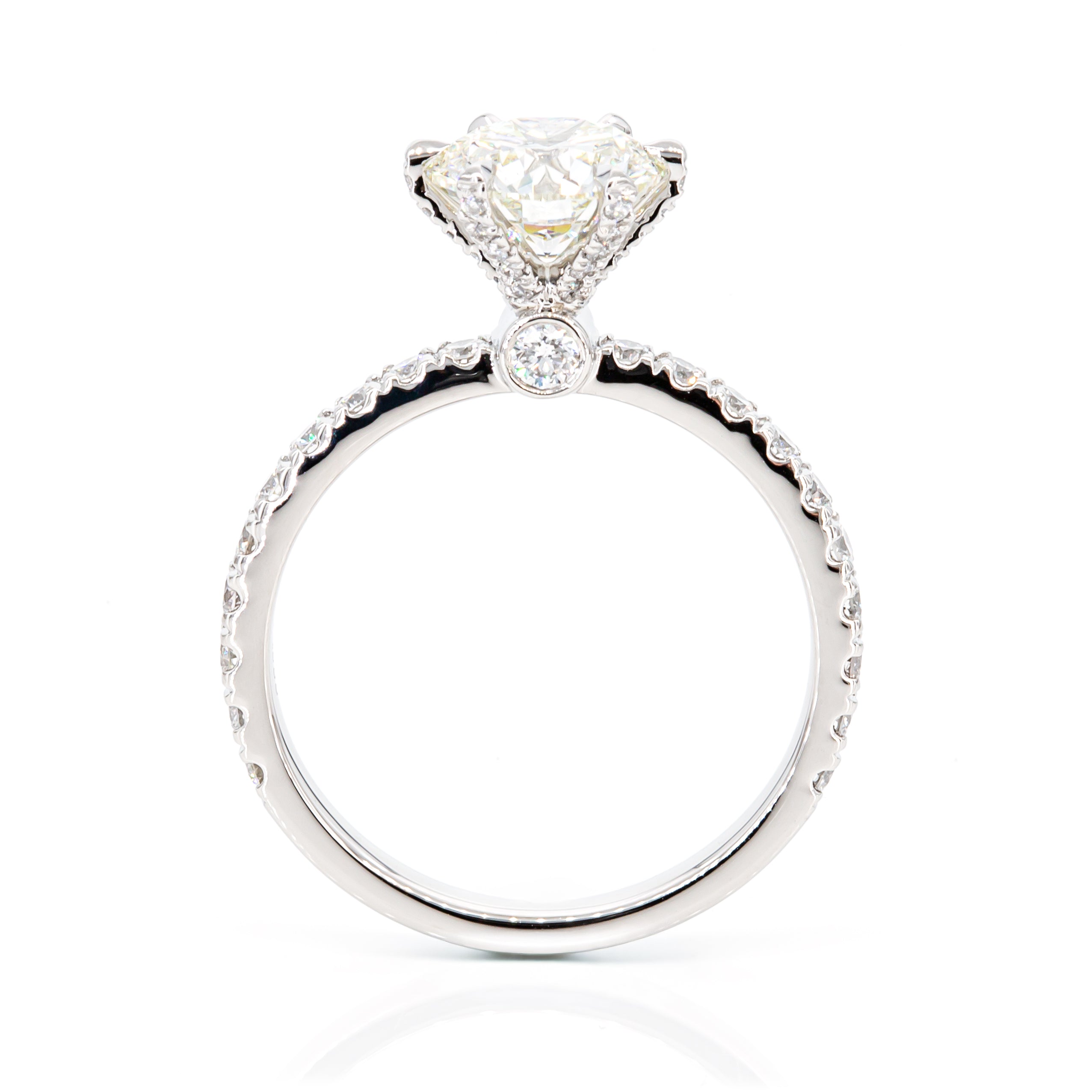 Pave-set Crown 1.50ct GIA Diamond Engagement Ring in Platinum 950, ring shank features 52 delicate pavé-set 0.58ct diamonds that will complement the center diamond of your choice.