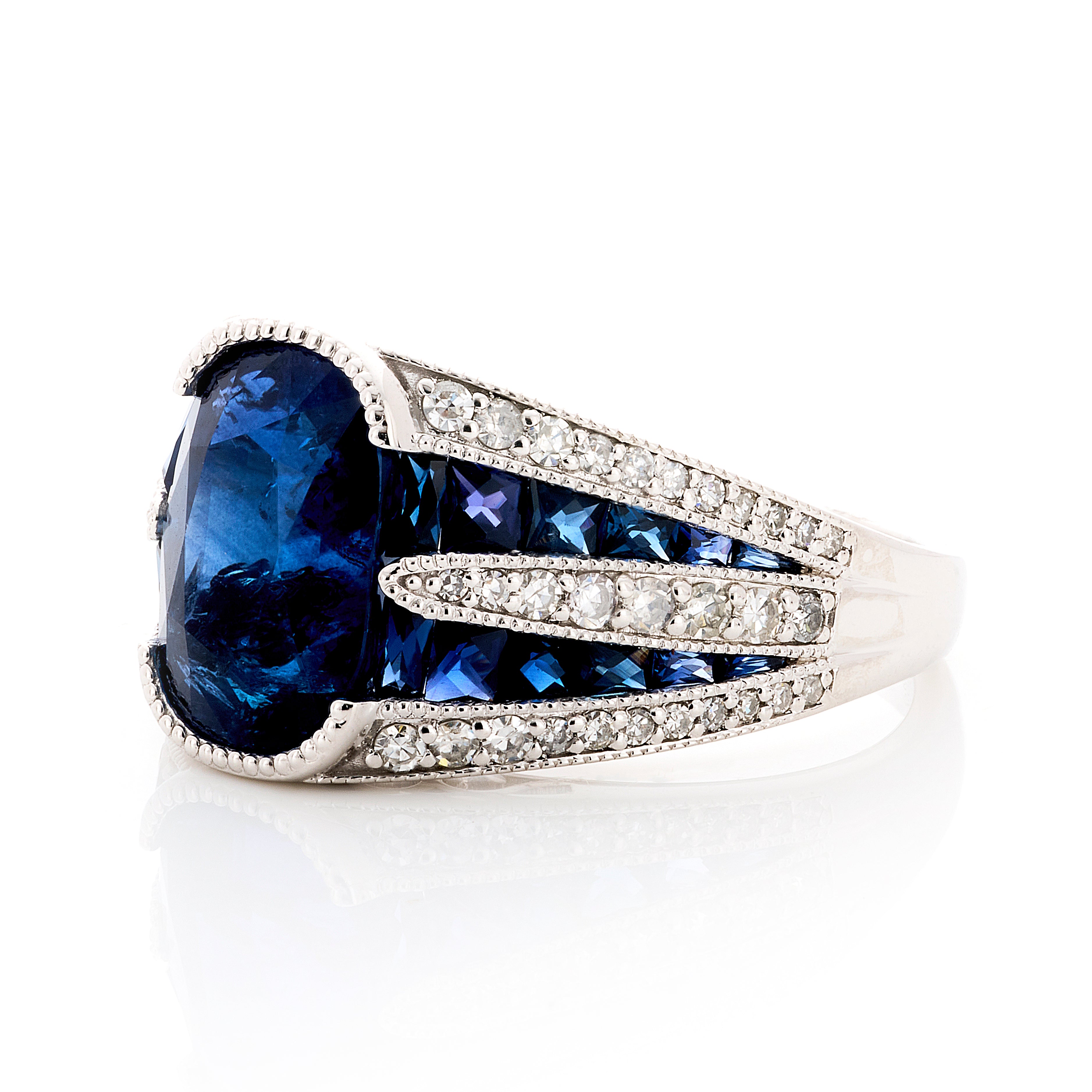 Indulge in the ultimate expression of luxury with this 5.01-carat natural blue sapphire, a gemstone of exceptional size and brilliance. Its deep, regal blue hue is perfectly complemented by a halo and shoulders adorned with sparkling diamonds, creating a breathtaking display of elegance and sophistication.