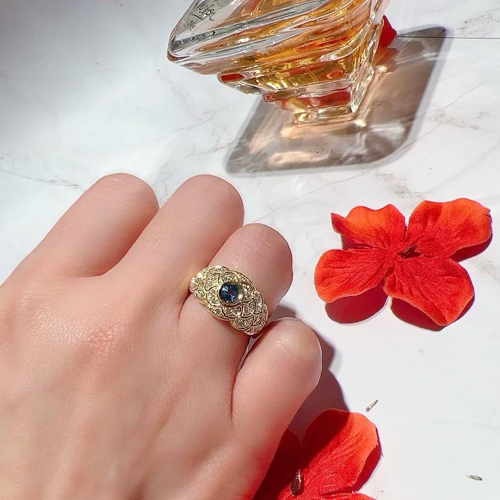 Art Deco 18K yellow Gold Blue Sapphire Diamond Fancy Ring - SOLD