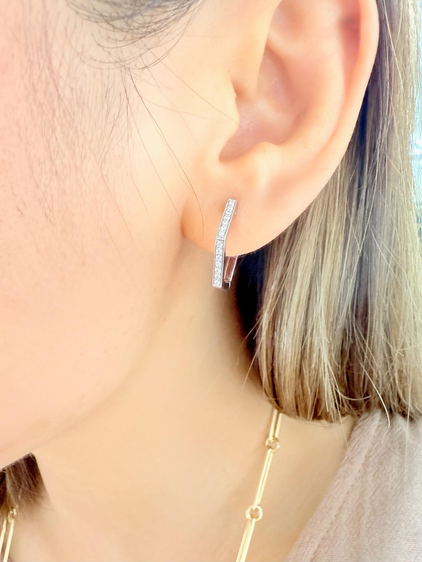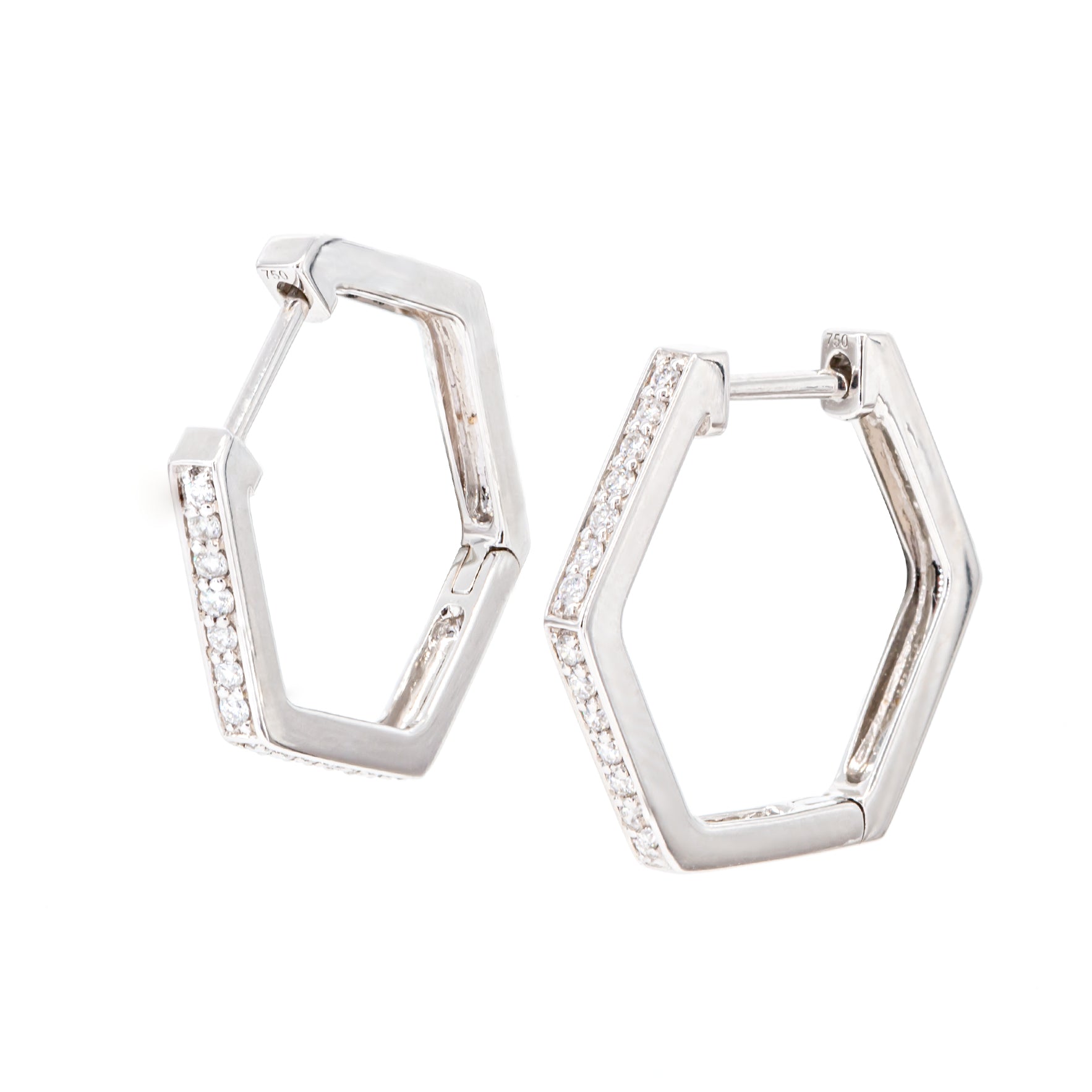 These 18mm hexagon hoop earrings are crafted from 18K white gold and set with 28 round diamonds totaling 0.214 carats. Weighing 4.34 grams per pair, they offer a modern geometric design with expert craftsmanship and lasting elegance.