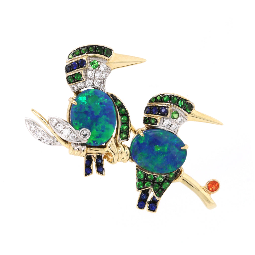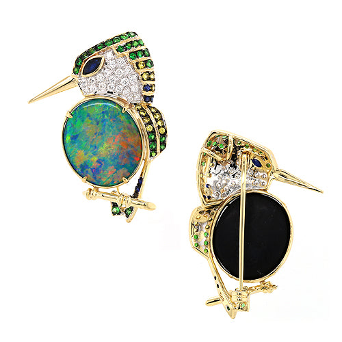 Opal, Diamond and Multi-Coloured Gemstone Brooch in 14K Yellow Gold