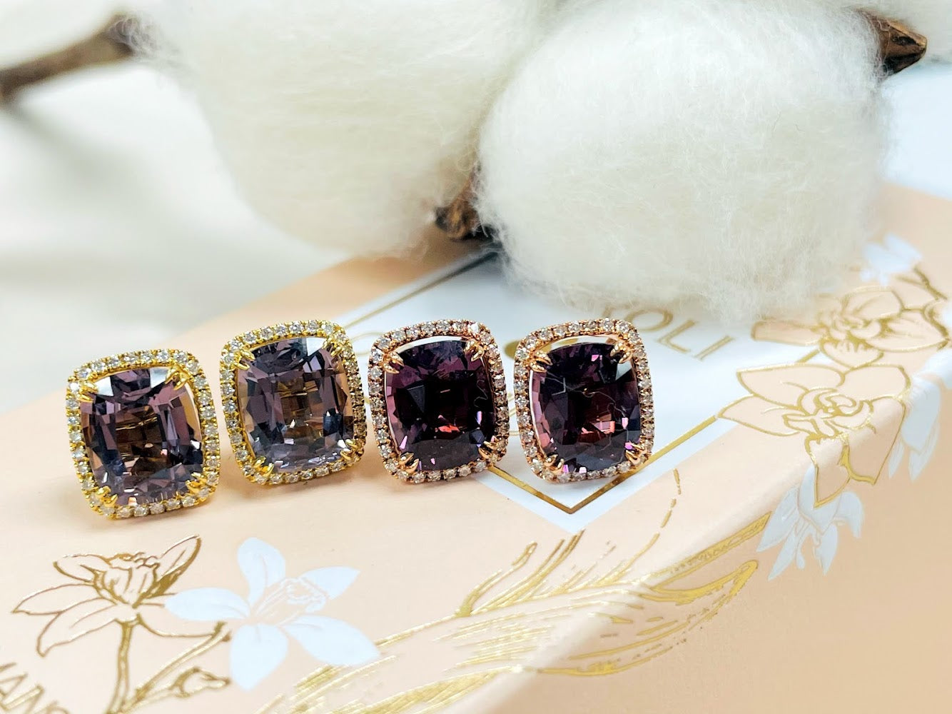 These playful earrings sparkle with colorful Burmese spinels surrounded by detachable natural diamonds halo, set in 18K rose or yellow gold for a joyful pop of luxury.