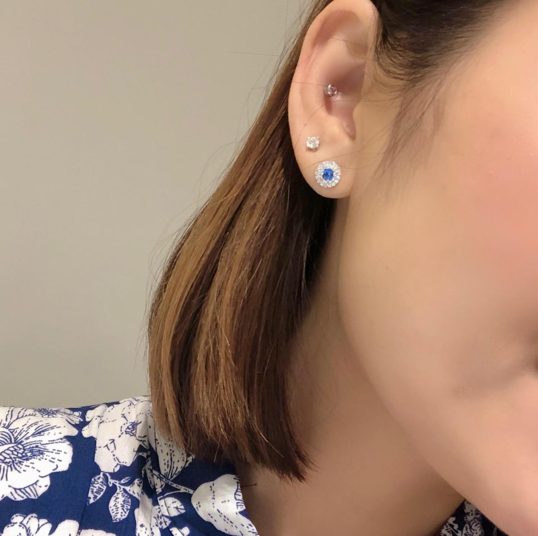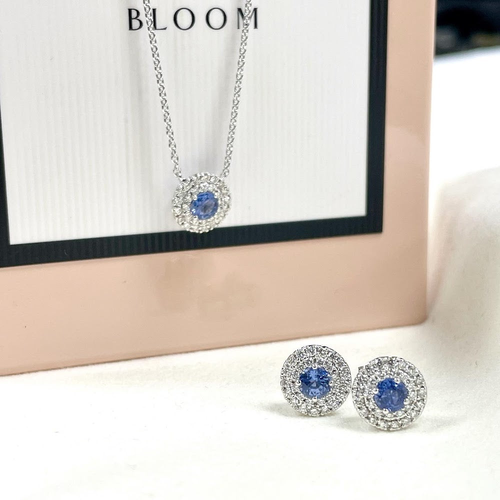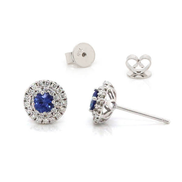 Blue Sapphire Double Halo Diamond Stud Earrings 18K White Gold