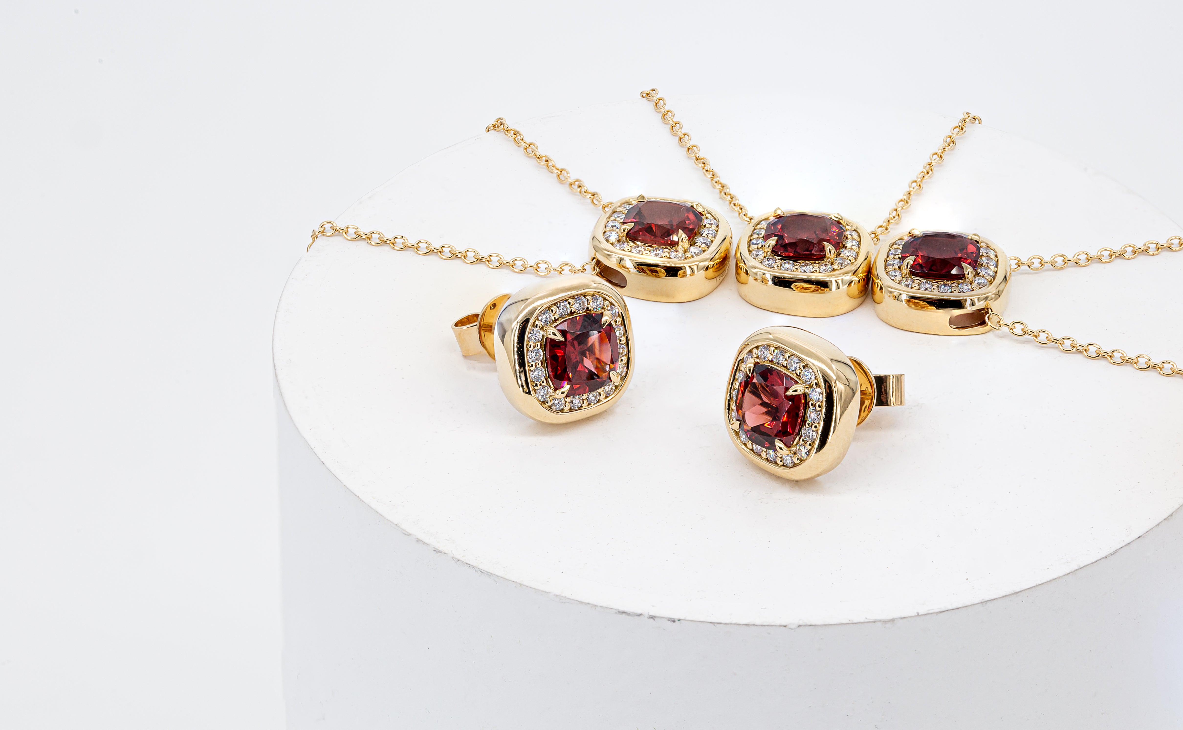 These playful 18K yellow gold stud earrings feature two vibrant garnets. The garnet diamond necklace can be made as a matching set.