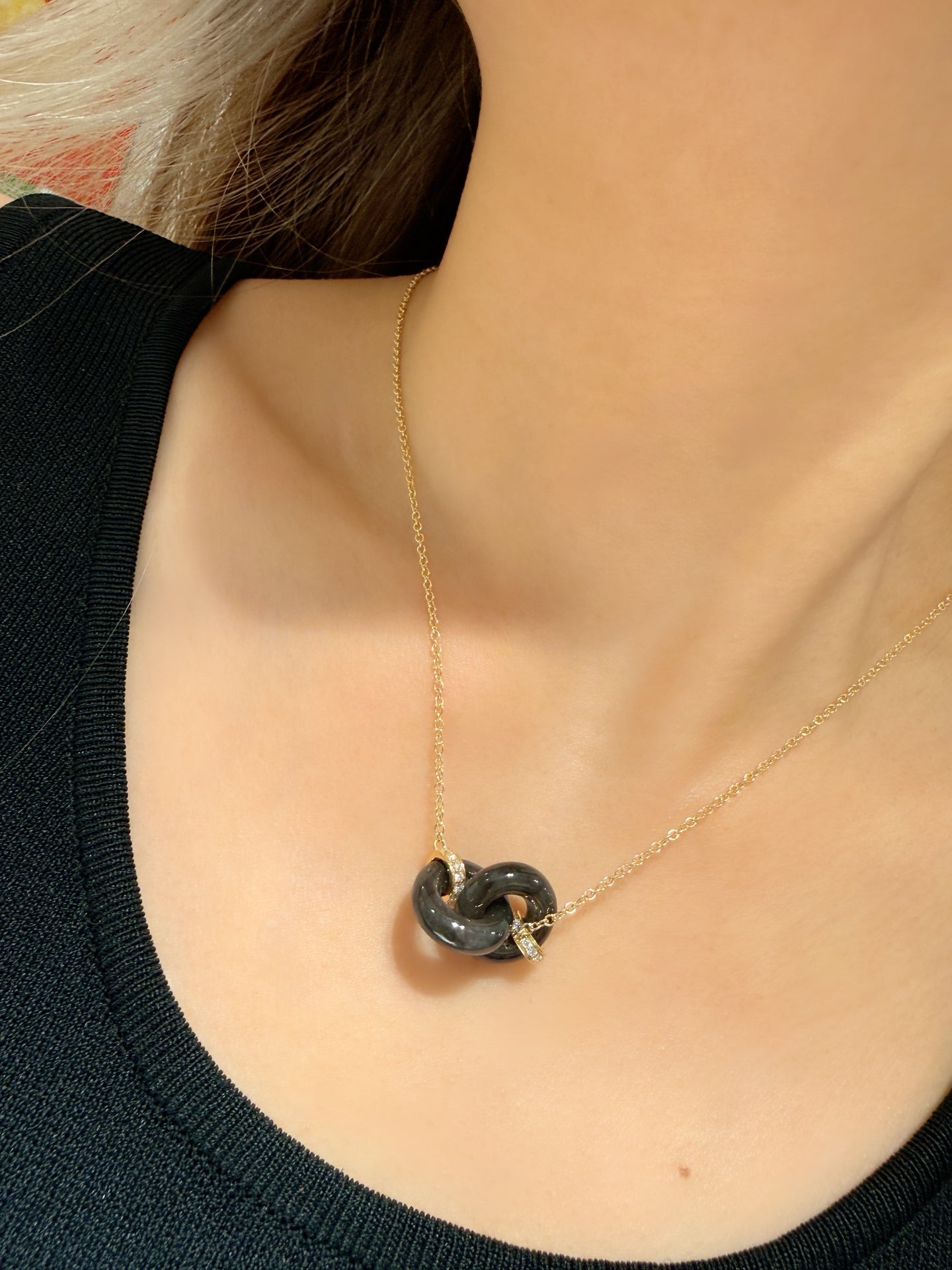 Exquisite 18K yellow gold necklace, featuring two luminous jadeite stones weighing 3.47gm. Accentuated by natural round diamonds. This piece combines the timeless beauty of jadeite with the subtle brilliance of diamonds. Ideal for those seeking a sophisticated yet versatile accessory, this necklace seamlessly blends refined craftsmanship with natural elegance.