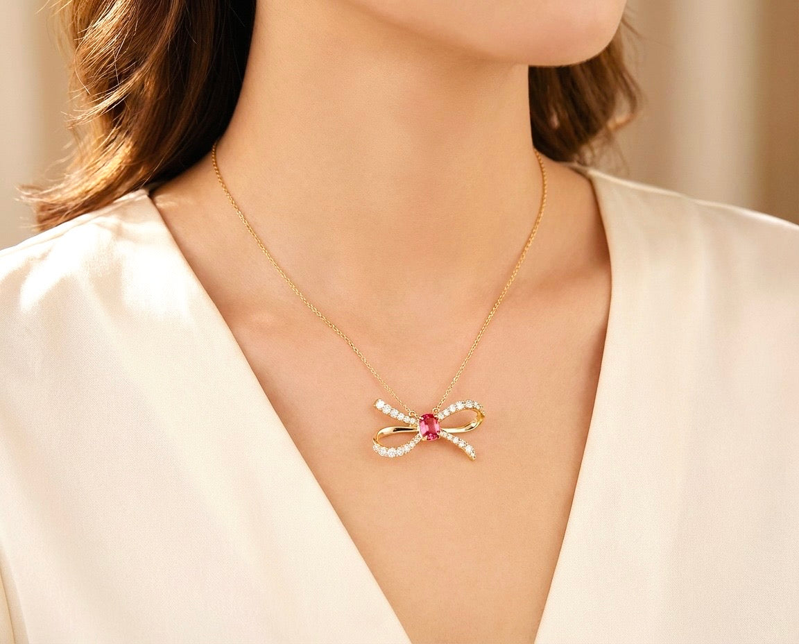 This exquisite pendant features a uniquely crafted bow design, embellished with a stunning spinel gemstone that radiates elegance and charm